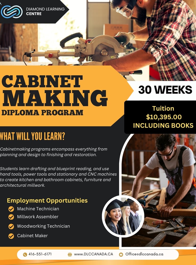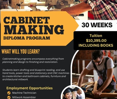 Craft your future in woodworking with the Cabinet Making Diploma Program, designed to develop your skills in the art and science of building custom cabinets, furniture, and millwork. This hands-on program teaches precision woodworking techniques, materials knowledge, and the use of industry-standard tools and machinery.
