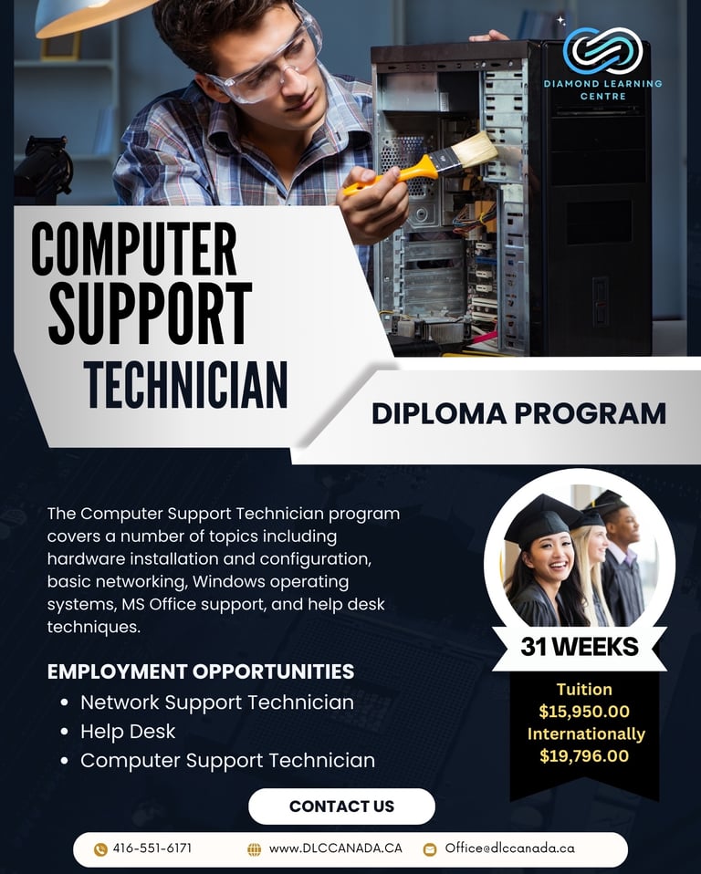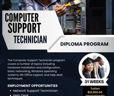 Step into the fast-paced world of IT with our Computer Support Technician Diploma Program, offered 100% online to fit your schedule. This career-focused program equips you with the technical skills and problem-solving abilities needed to provide essential computer, software, and network support across various industries.