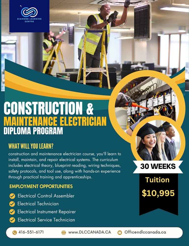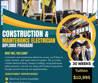 Power your future with the Construction & Maintenance Electrician Diploma Program, designed to prepare you for a dynamic career in electrical installation, maintenance, and repair within residential, commercial, and industrial environments. This comprehensive, hands-on training program aligns with provincial apprenticeship standards and covers essential electrical theory, safety practices, and practical skills.