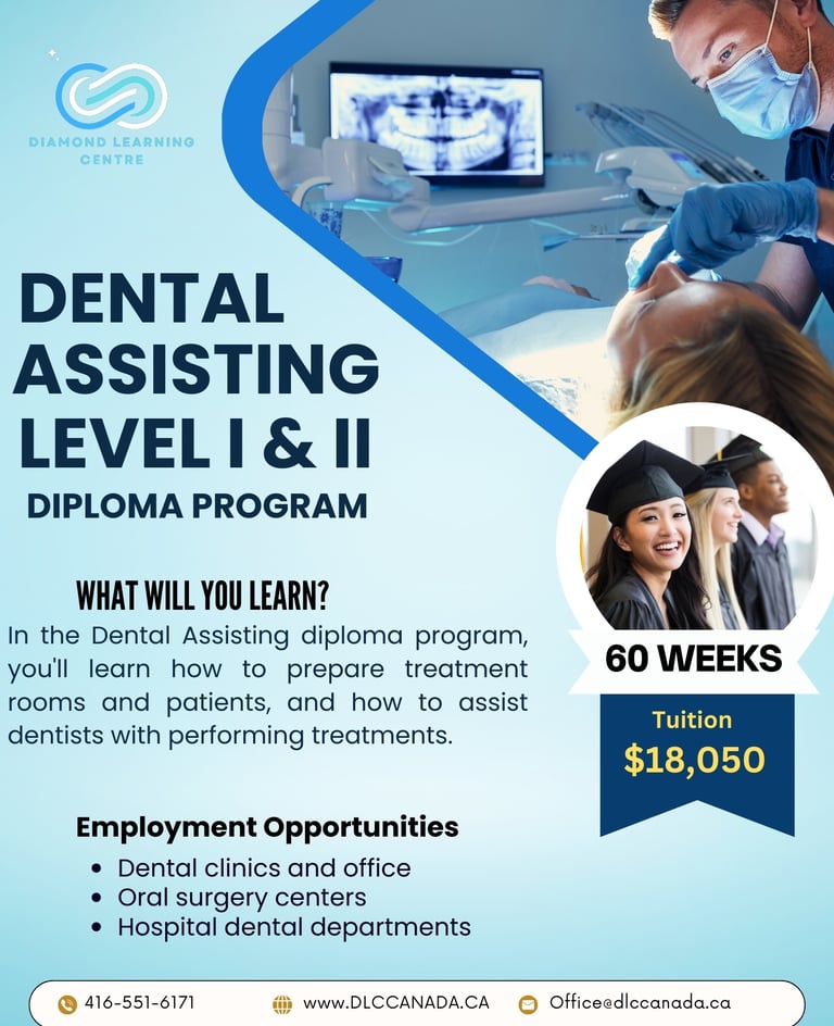 Step confidently into the world of dentistry with the Dental Assisting Level I & II Diploma Program, designed to equip you with the clinical and administrative skills needed to become a vital member of a dental healthcare team. This comprehensive program meets or exceeds national and provincial standards, preparing students to perform chairside assisting, take and process X-rays, sterilize instruments, manage patient records, and educate patients on oral health.