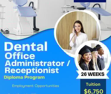 Start your career at the heart of a dental practice with the Dental Office Administration / Reception Diploma Program, designed to prepare you for a professional, in-demand role in the dental field. This program focuses on developing strong administrative, communication, and technical skills required to efficiently manage front office operations in dental clinics and specialty practices.