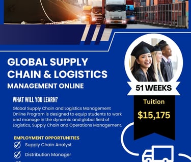 Advance your career in the global marketplace with the Global Supply Chain & Logistics Management Diploma Program, designed to equip students with a deep understanding of international logistics, procurement, inventory management, and supply chain strategy. This comprehensive program focuses on the end-to-end movement of goods and services across borders, preparing you for leadership roles in global trade, transportation, and operations.