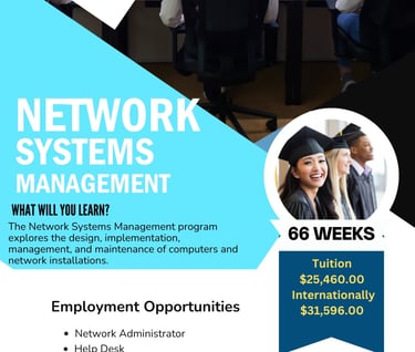 Power the infrastructure of modern organizations with our Network Systems Management Diploma Program, designed to prepare you for a high-demand career in IT networking and systems administration. Delivered online with optional hands-on labs, this program equips you with the technical expertise to design, maintain, and secure network environments that keep businesses connected and productive.