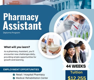 Step into the fast-growing field of pharmacy support with the Pharmacy Assistant Diploma Program, designed to prepare you for an essential role in community and hospital pharmacies. This flexible program delivers comprehensive training in medication preparation, inventory management, customer service, and pharmacy law, helping you support pharmacists in delivering safe and effective patient care.